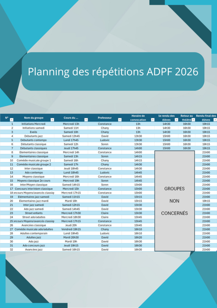 Concernant les costumes, ils seront remis aux élèves le jour même puis récupérés à la fin de la répétition. Que tous les élèves prévoient leur tenue de cours pour la 1e partie de la répétition.